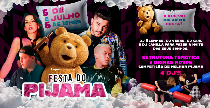 uma Festa do Pijama imperdível, que vai acontecer nos dias 05 e 06 de julho no nosso queridíssimo Esquenta! Serão 2 dias de Festa, com os DJs Blemmes, Veras, Carl e DJ Camilla. 🍹🎈